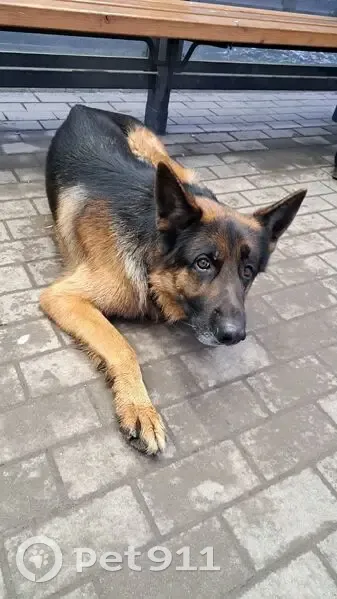Внимание! Во Фрунзенском районе на остановке ул.Судостроителей лежит овчарка, видно что потеряшка. Вид грустный, ко всем подходит ищет хозяина. На нее ошейник с креплением красного цвета, под ошейником показалась ещё строгач. Глаза карие, спинка черная, бока и лапы бежевые.