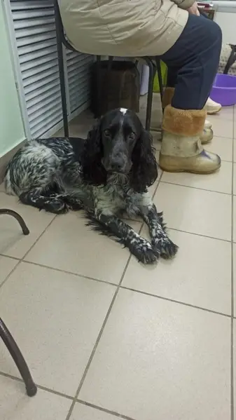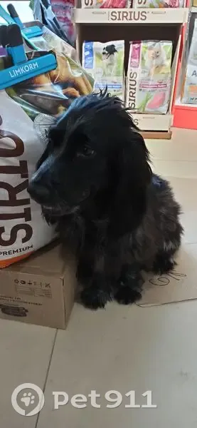 Черная с серебром подшерсток, ушки висячие, спаниель, молодая, девочка. Ошейник красный. Ласковая. Бегала возле Ивняковской школы, Ярославская обл. Прибежала в торговый центр Ива. Сейчас в магазине корм для животных.
