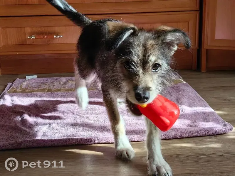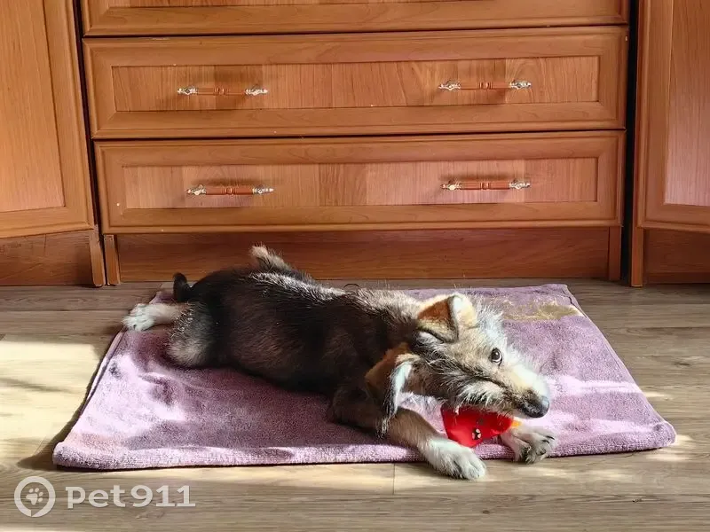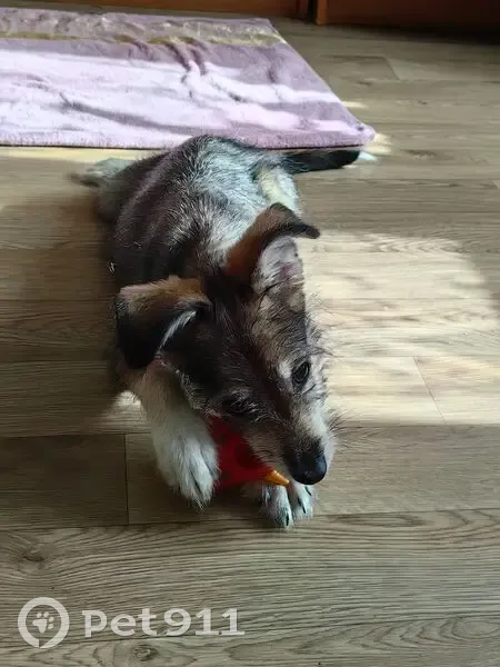 Щенок 3-5 месяцев, сука, коричнево-черного окраса, на морде есть висюльки, белые чулочки на передних лапах, кончик хвостика белый. Девочка очень ориентирована на человека и голос, бегает по квартире хвостиком, с ребенком 5-ти лет играет аккуратно. Очень сомневаюсь, что уличный щенок, скорее убежала совсем недавно, тк слишком чистая и ухоженная, несмотря на дожди и грязь на улице.
