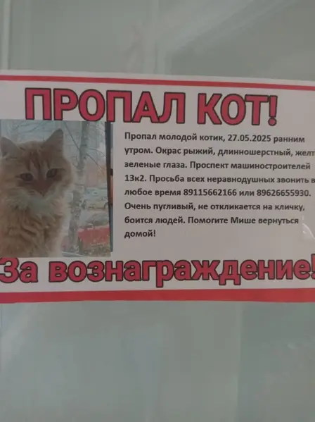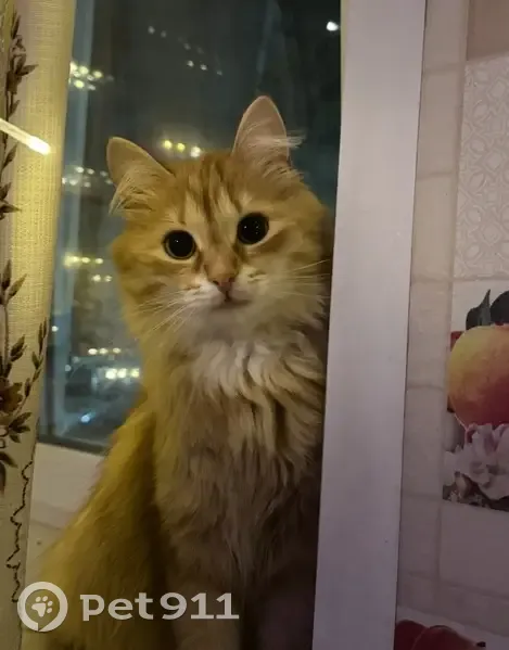 рыжий длинный кот, стройный, длинношерстный, зелено-карие глаза, есть белые пятнышки, волосы на животе и шее вьются, очень пугливый. Сорвался со шлейки, крайне пугливый.