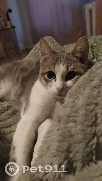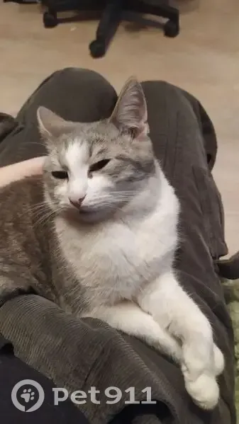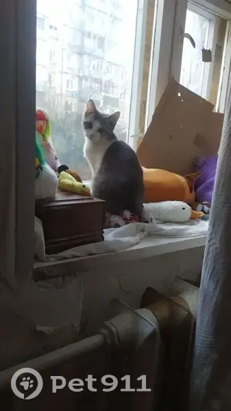 Серая спинка, хвост. Белый живот лапки. Мордочка на половину серая, на половину белая. Пугливый, но очень ласковый. Вместо мяуканья пищит или чирикает. Жёлтые глаза