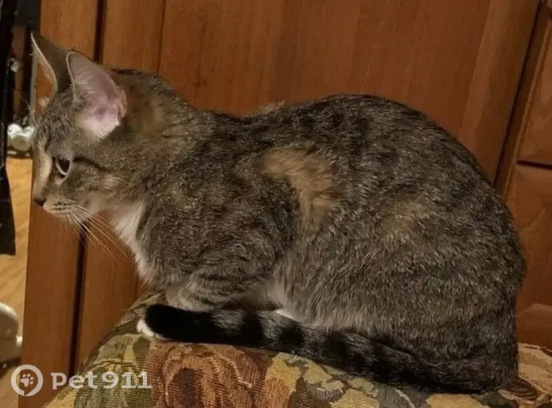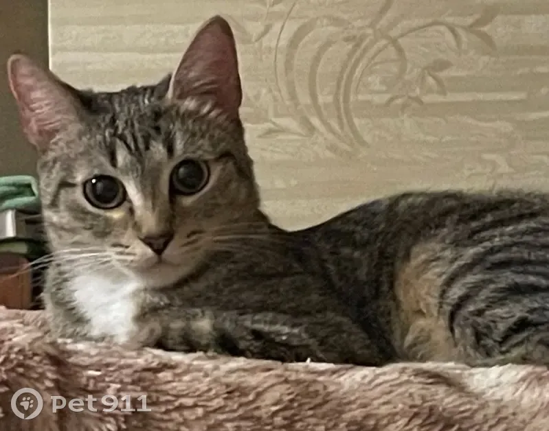 Пропала молодая кошечка Маргоша. Возраст 2 года. Около дома 9 по ул. Юности Полностью домашняя.Окрас табби полосатая, лапки и манишка белые, хвост черные полоски. Виден на фото. Упала с окна , спряталась в подвале, один раз видели ее там при обследовании, но она с испугу спряталась и больше найти не получилось.