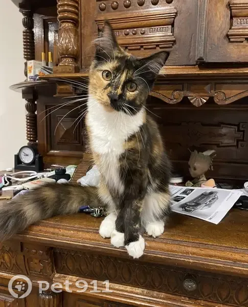 Мейн Кун, умная ласковая кошка. Не закрылась до конца дверь, выскочила в подъезд. Дом старый в подъездных дверях имеются порезанные маленькие проходы для кошек. Она видимо убежала через них. Обошли ближайшие дома, без результатно