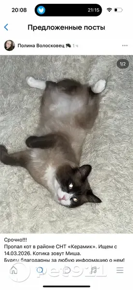 Миша крупного размера, у него голубые глазки и длинная мягкая шерсть.На лапках подушечки черного цвета. Может испугаться незнакомых людей. Убежал из дачного домика в СНТ «Керамик» Ярославская область 14.03.2026.