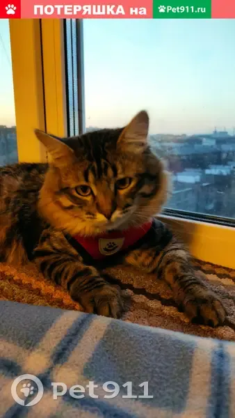 Возраст 1.3 года, вес 5кг, привитый, кастрированный. В меру пушистый. Людей не боится, но пугливый. Во время потери на шее был серый блошиный ошейник и золотистый медальон.