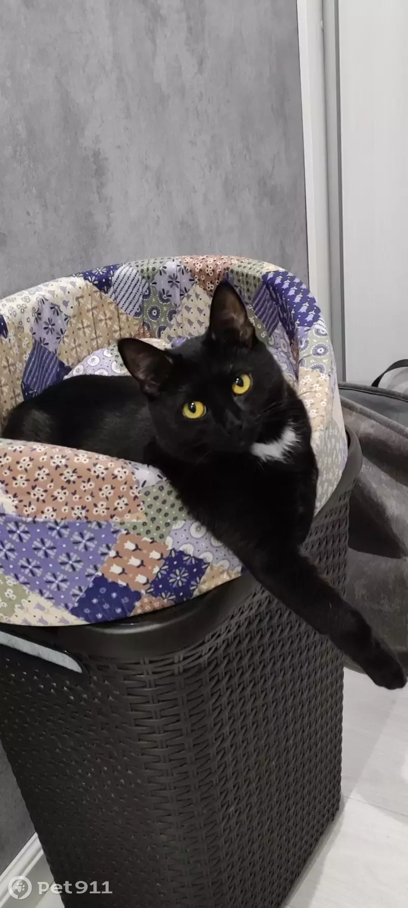 Выбежала из подъезда кошка,домашняя, стерилизована, чёрная с белой манишкой на шее,на улице ни когда не была может находиться в стрессе. Возвраст 5 лет, кличка "Соня"