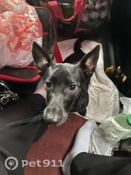 Помесь таксы, белое пятнышко на груди, а так полностью черный, уши торчком, но если боится то прижимает их, пропал с передержки, убежал в дырку в заборе…
