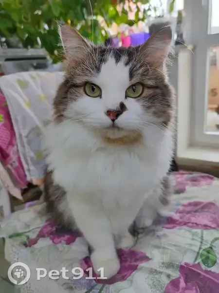Кошка пушистая, окрас, белая манишка,лапки белые, спинка коричневая,полосатая на носу слева отметина черная, глаза жёлтые. Просим вернуть в семью за вознаграждение.