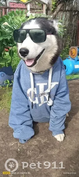 Черно-белый кобель. Не кострирован. Глазки голубые. Правое ушко обгрызенно в бою. Оранжево-голубом ошейник с орнаментом. Очень добрый ребенок. Не кусается, не бросается, но за ошейник взять не дастся. Вывернется и убежит.