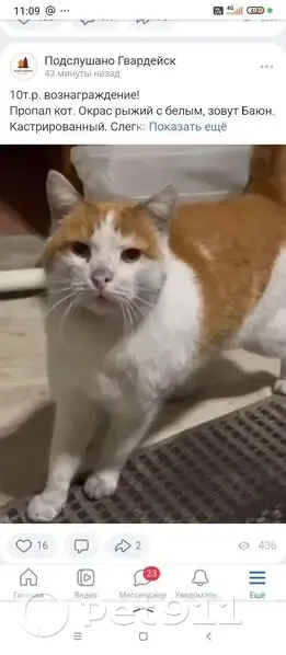 Пропал кот. Окрас рыжий с белым, зовут Баюн. Кастрированный. Слегка деформирован нос. Убежал из поселка Ясеньское и возможно направляется в посёлок Комсомольск.