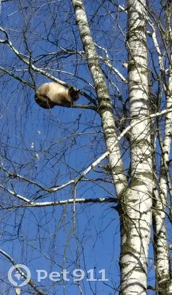 Фенотип Тайской или Сиамской породы. Упитанный. На глазу что-то типа бельма. Сидел высокого на дереве.