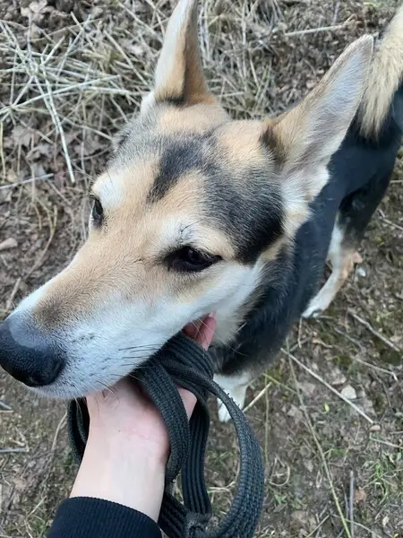 Собаке около года. На собаке красно-Черная шлейка и пластиковый намордник.