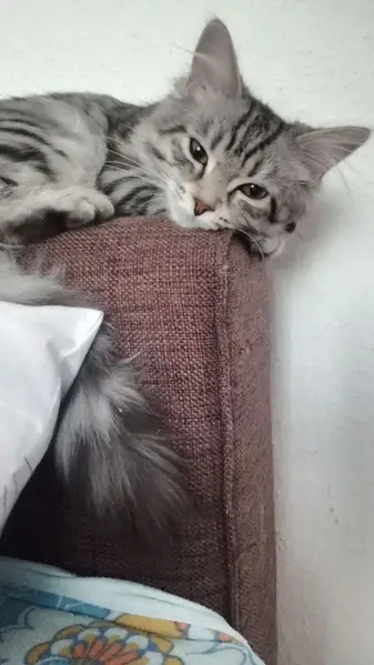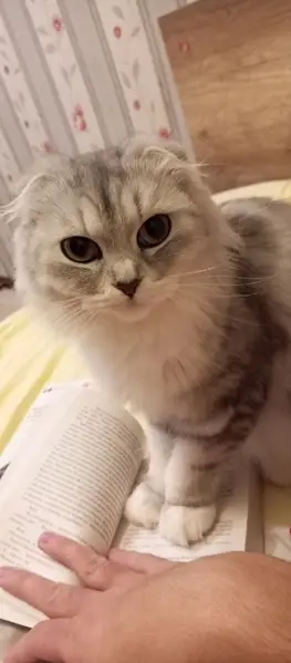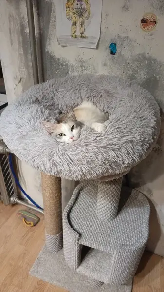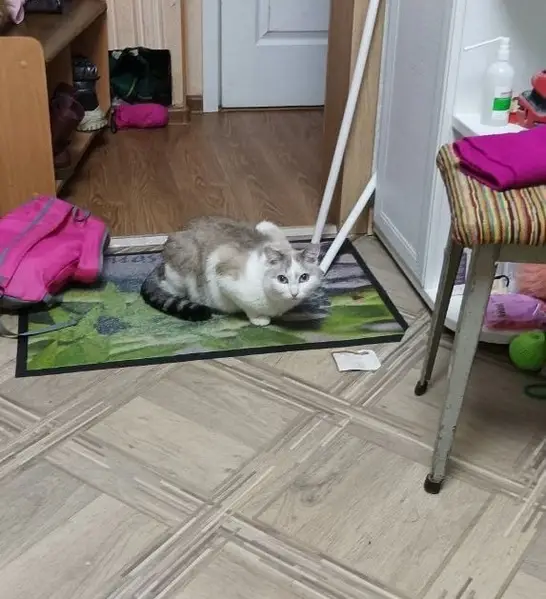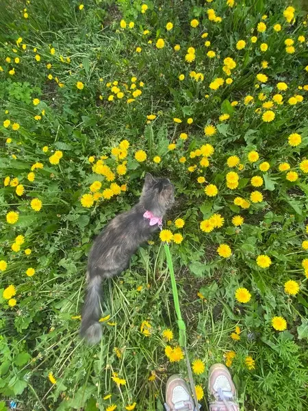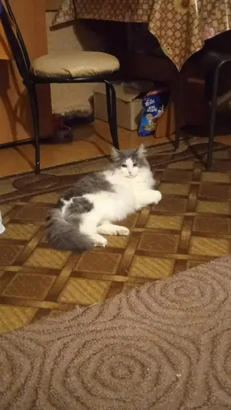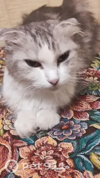 Серо-белая пушистая вислоухая кошечка с немного раскосыми необычными глазами сидела в траве и громко мяукала. После "разговора" с нами увязалась и шла три квартала. Видно, что Кошечка домашняя, постоянно умывается, лапки моет часто, так как не привыкла ходить по земле. По словам ветеринара, возраст примерно год-два. Очень боится машин и их шума.