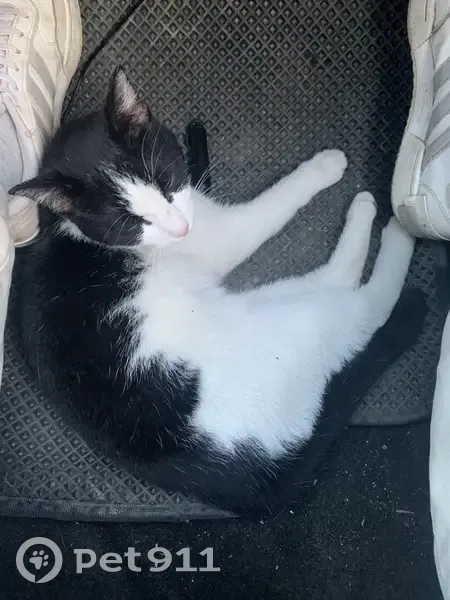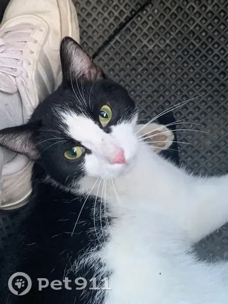 Окрас черно-белый, зеленые глаза, розовый носик. Очень ласковый кот, явно домашний: не боится, сам подходит, мурлыкает, спросили у прохожих, до этого на улице не наблюдался