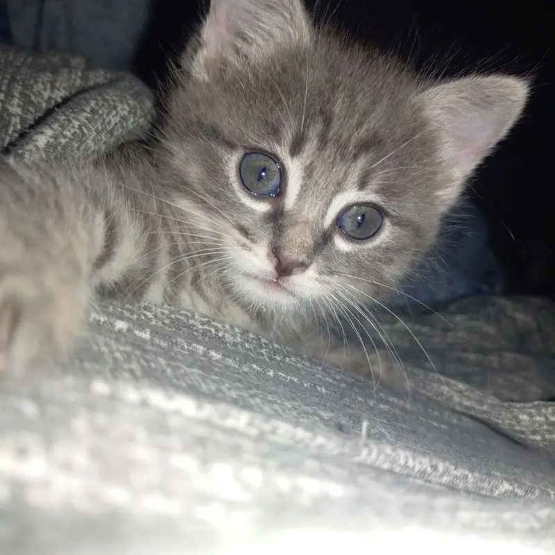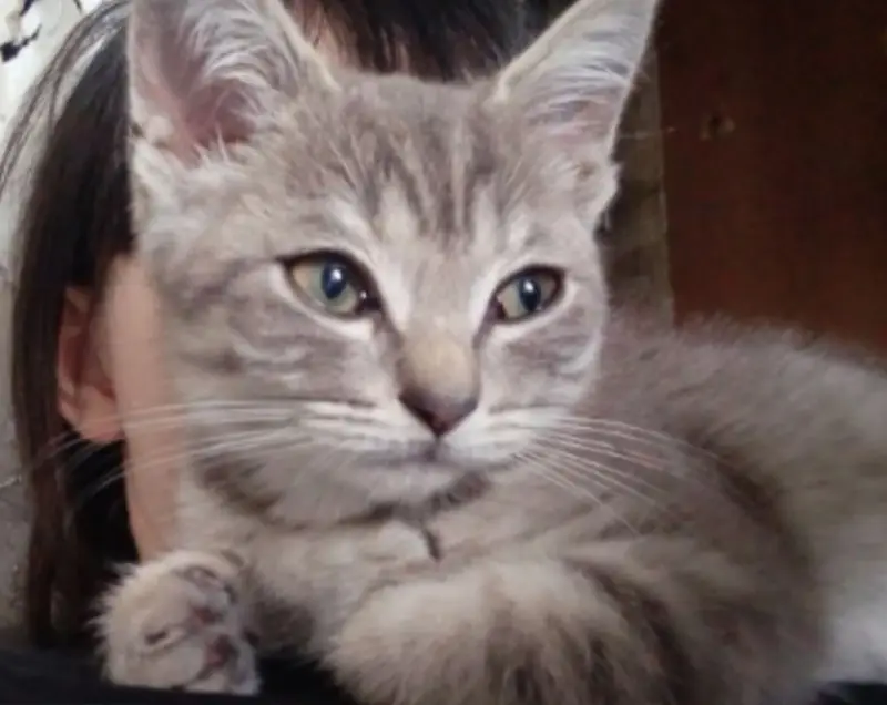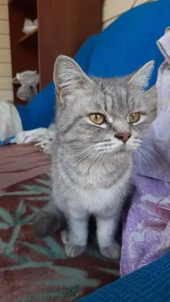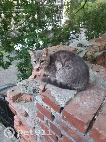Маленькая кошечка/ок.4 месяцев, ласковая, явно бывше-домашняя, красивая, серая с узором, носик коричневый. Сидит уже неделю и не уходит у тропинки во дворах. Все идут мимо, кто-то кормит пакетиками.