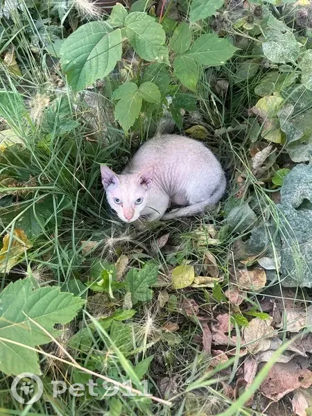 Похож на сфинкса, но с шерстью; худой, но явно домашний, на улице недавно. На кис-кис обращает внимание, но не подходит, прячется под машинами и мусорными контейнерами