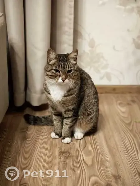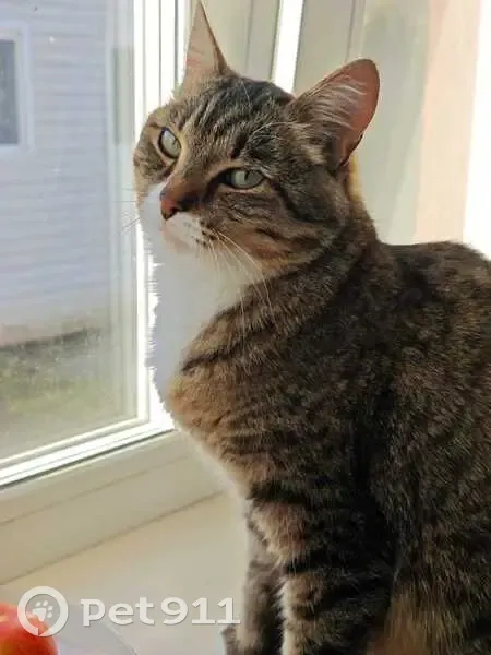 Кошка полосатая с белой манишкой. Сломан хвост. Небольшого размера.