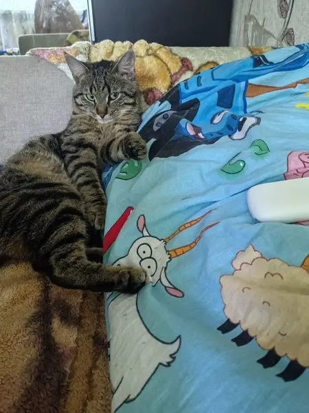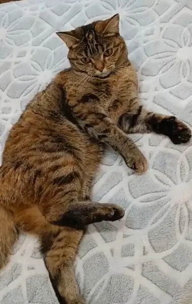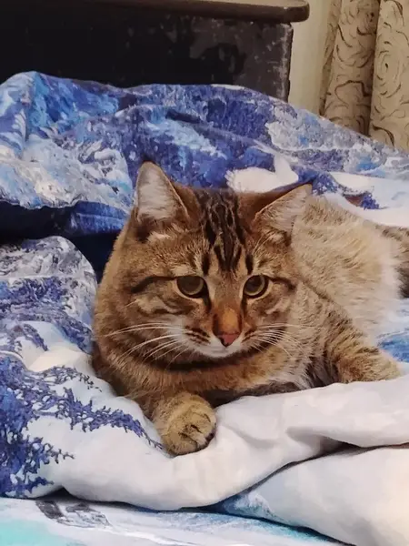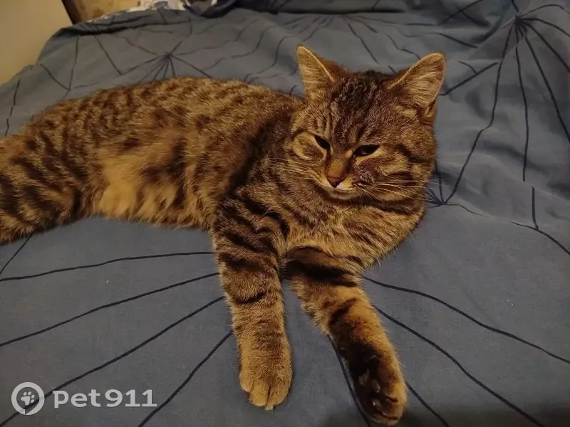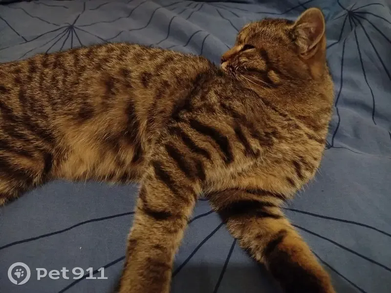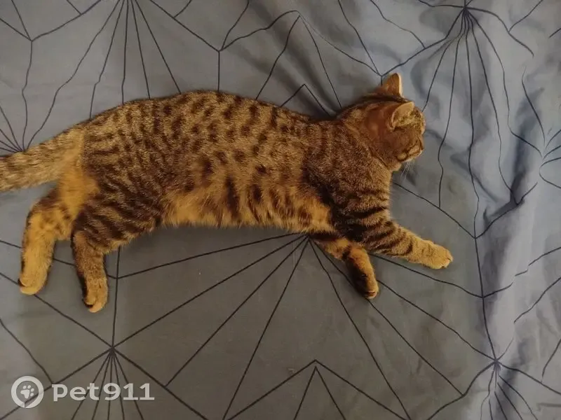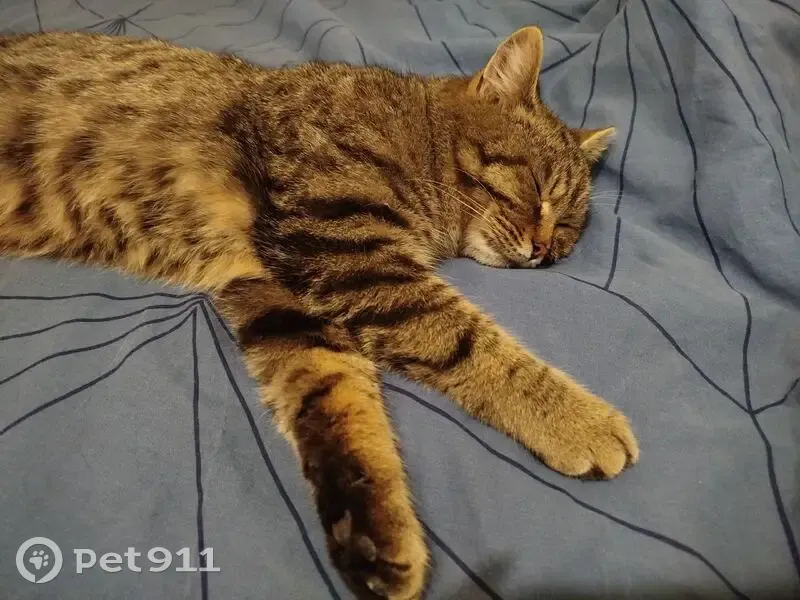 Окрас жёлто-коричневый полосато-пятнистый, кот ухоженный, уши-зубы-когти чистые, подшёрстка нет, характер добродушный, ленивый, очень любит спать, достаточно крупный, где-то под 6 кило, визуально бубенцы на месте. Сам уходить никуда не порывается.
