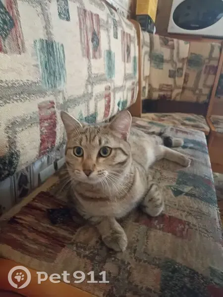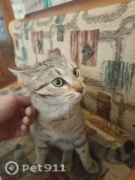 Пятнисто полосатого окраса. Очень ласковый. Пахнет шампунем, по всём параметрам домашний.