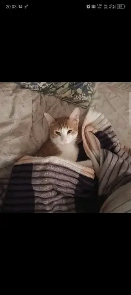 Порода неизвестна, бело-рыжая кошка, около года, на белых лапках небольшие рыжие пятнышки, мордочка худенькая, немного треугольная. Найдена под деревом у проезжей части, недалеко от "Верного". Удалось приманить едой и забрать