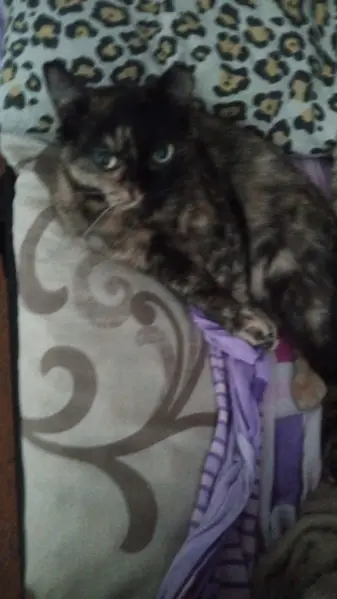 Найдена кошка, окрас черепаховый, глаза зелёные, не крупная, очень ласковая и отзывчивая. Лоток знает. По виду домашняя. Нашли её сидящей на дереве во дворе. Ищем новых или старых хозяев.