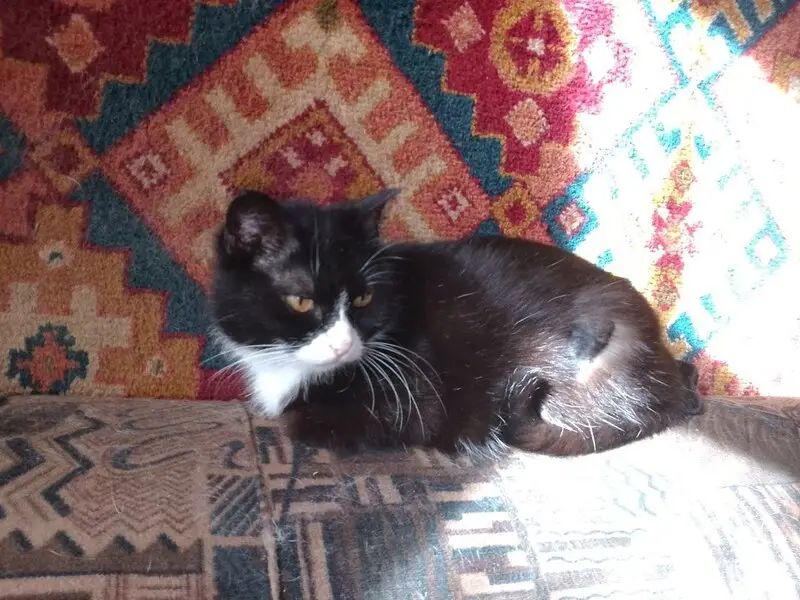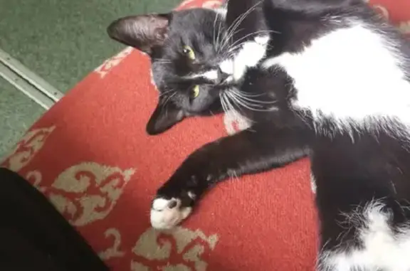 Маленький, черный кот с белыми пятнами, 1-2 года, не кастрированный, желтые глаза. Ухоженный, домашний. Разбита губа и вывехнута задняя лапа. Похоже выпал из окна.