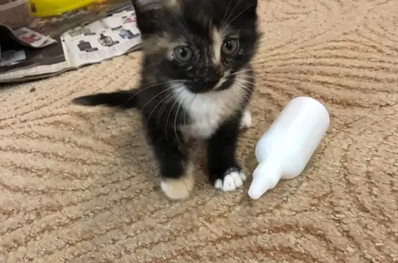 Котенок, на вид 3 месяца, был найден в подъезде дома Пехотинцев 12, ручной, кушает сухой корм, пахнет шампунем для котят. Цвет черный, с белыми лапками.