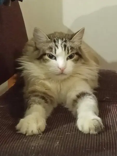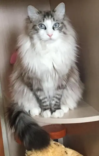 Замечена пушистая кошка /кот, окрас серый с белым (Екатеринбург, Юго-Западный) Приходит уже второй раз, очень голодная, похожа на домашнюю, очень ласковая. Возможно кончик хвостика сломан и правое ухо чуть-чуть порвано. Сделали мини домик, еду и воду даем.