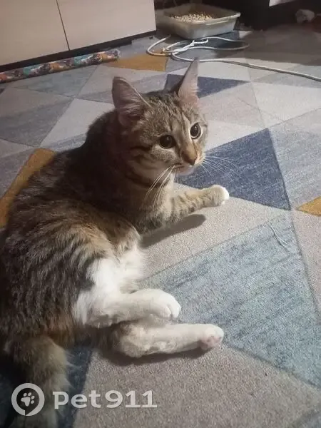 Серая полосатая кошечка с большими рыжими глазами. Грудка и живот белые с персиковвми подпалинами. Шерстка блестящая и здоровая, глаза без выделений, ушки с внешней видимой части чистые, но внутри выделения есть, возможно, ушные клещи. Девочка на вид молодая (+/- 1 год), беременная. Лоток хорошо знает (стрессовала, но на второй день пребывания в комнате сходила на место и продолжает делать дела правильно).Обнаружилась на втором этаже, потом забежала на пятый. Временно на передержке, но надолго оставить не получится.