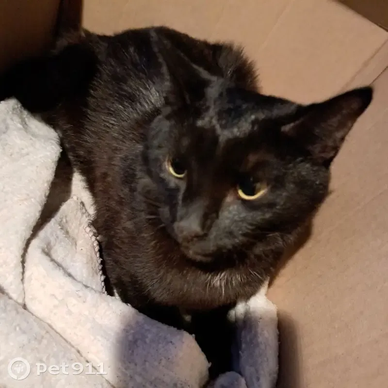 Окрас черный с проседью, на груди и животе небольшие белые пятна. Глаза жёлтые. Сидела мокрая и испуганная на крыльце магазина. Возможно, выпала из окна.