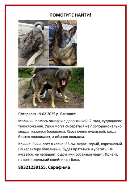 Собака прибилась к нам, когда мы ехали на велосипедах по трассе. Сейчас находиться на передержке. Собака добрая, контактная, активная, с другими животными и детьми ладит. Ищем хозяина