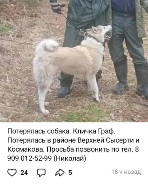 Замечена собака, кобель, предположительно лайка, в Уктусском лесопарке. На ней был обрывок металлической веревки с карабином. Не зафиксирована, ее же видели в том же районе месяц назад в сентябре, возможно повторно сбежала.