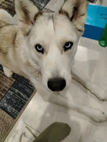 Подходит к людям, обнюхивает каждого, особенно детей , очень спокоен и дружелюбен, игрив, со стареньким ошейником, когти стрижены недавно и зубки очень белые , примерно 3-4 года, может больше, метис хаски и овчарки , забрали пока к себе, но долго держать не сможем.