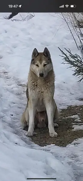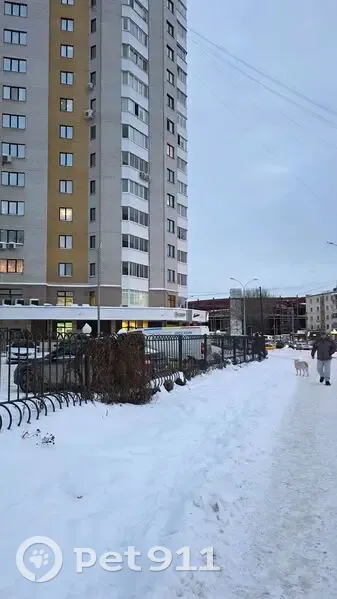 Светлая собака крупного размера ждёт около светофора. На внимание чужиж людей бежит с опаской. Подойти посмотреть ошейник не дала. Не агрессивная. Выглядит воспитанной. Откликается на свист. Очень грустные глаза у этой собаки. Она испугана.
