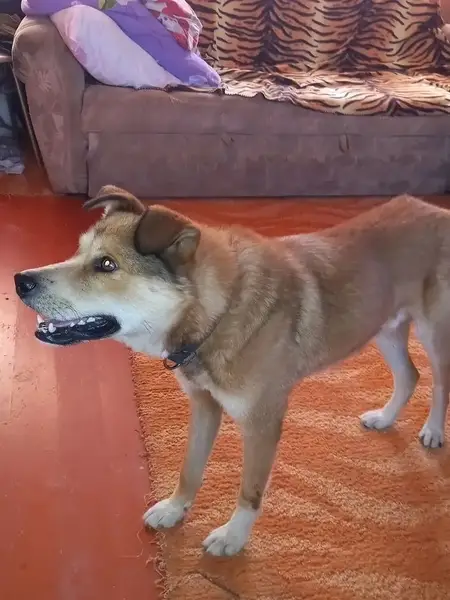 Рыжая лайка или смесь с сиба-ина, в черной шлейке Farmy doggs