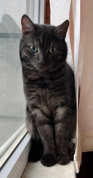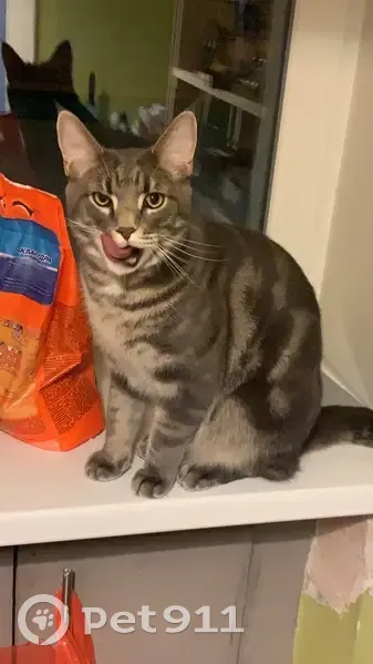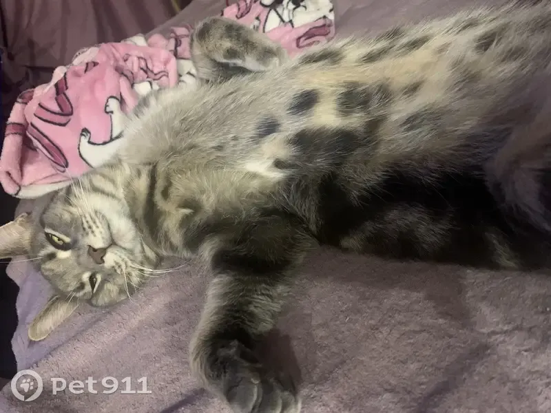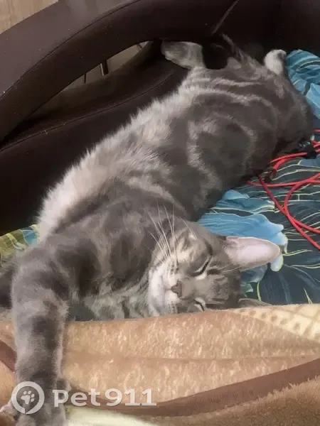 Помесь мейнкуна, кисточки на больших ушах, очень крупный, длинное туловище, серый окрас, хвост не пушистый. Глаза медового цвета. Спокойный не кидается, не кусается. Дочь вывела во двор ( по глупости) и он сбежал.