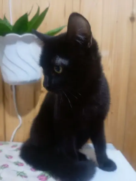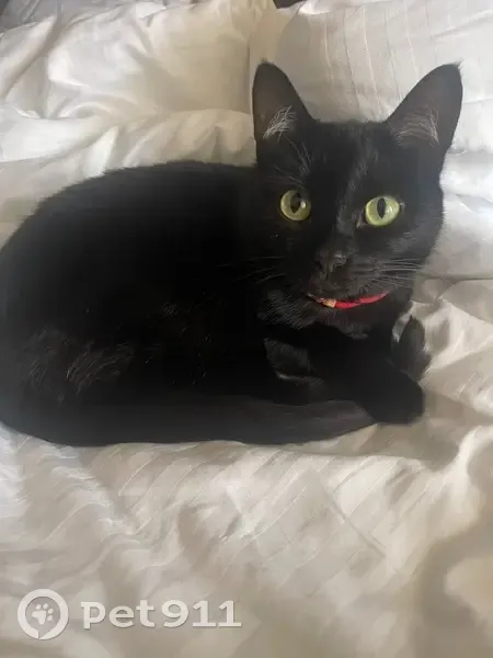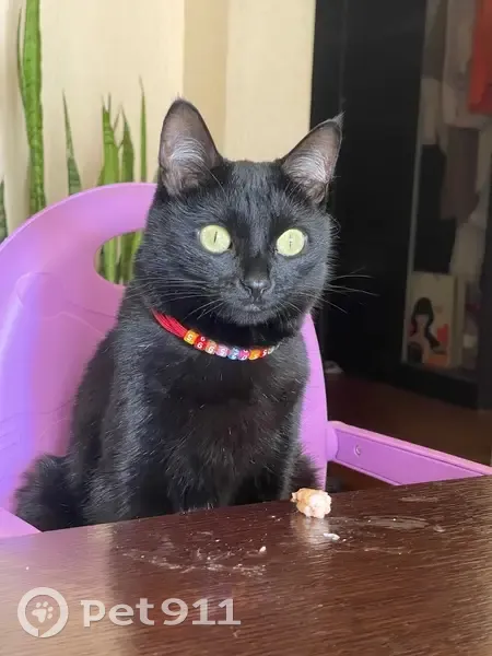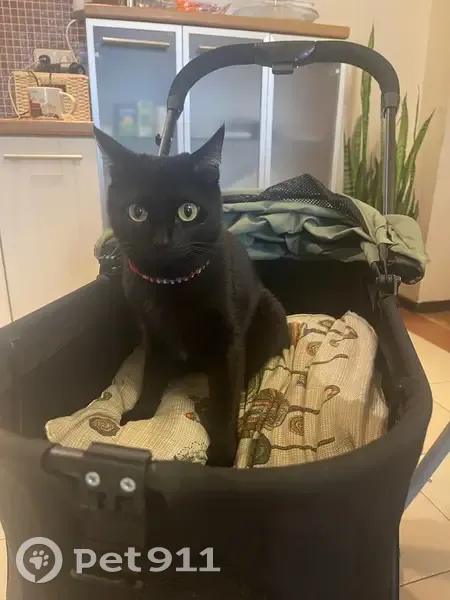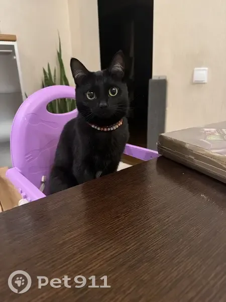 Черная кошечка с красным ошейником на шее, на ошейнике указан номер телефона. На грудке и на животе белые пятна. Утром проснулись, котёнка не нашли , выпала с балкона .