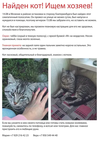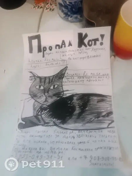 Космос большой полосатый темный кот,он наполовину мейн-кун ,на половину беспроводный,у него жёлтые глаза и расцветка похожа на расцветку бенгалов. Дочка уходила в школу,а космос выскочил за дверь мы не заметили сначала,хватились потом.Мы живём на 2 этаже и лифта нету. Он мог легко выскочить на улицу