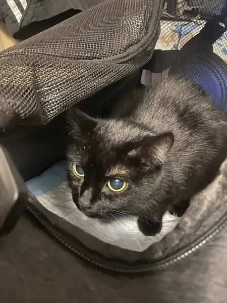 Девочка, черепаховый окрас(больше чёрного), маленькая - 7 месяцев, на животе и на лапе светлая шерсть (пятна), на попе виднеется рыжая шерсть, во рту на нёбе чёрное пятно, была в сером ошейнике от блох и клещей