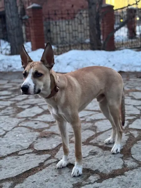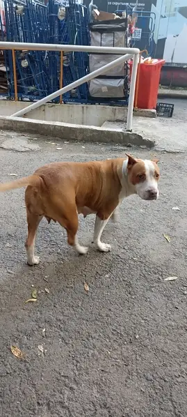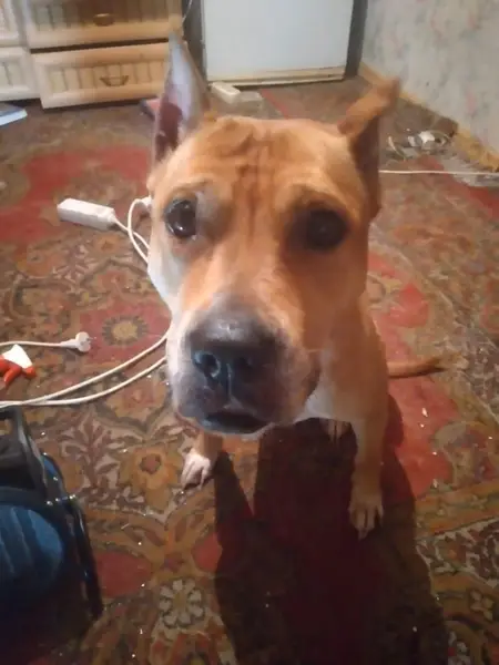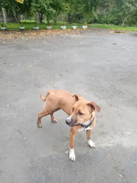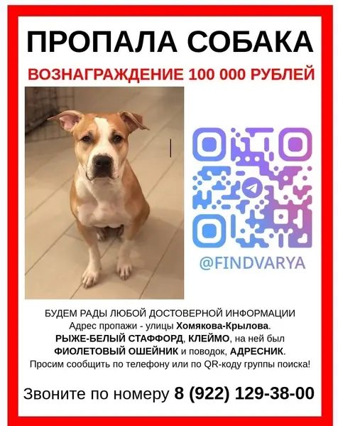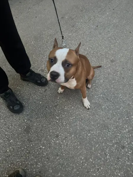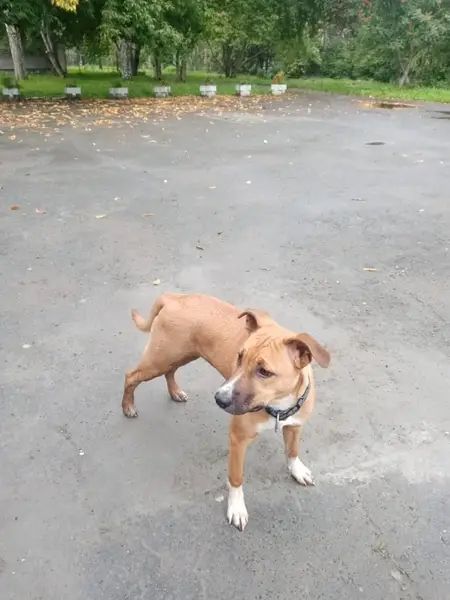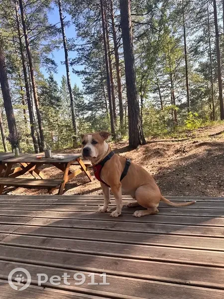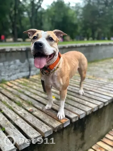 Окрас рыже белый, амстаф, пугливая и добрая, не любит громкий шум. На ней был ошейник, поводок, адресник. Клеймо. Возможно ее увезли в Пионерский район. На спец питании.