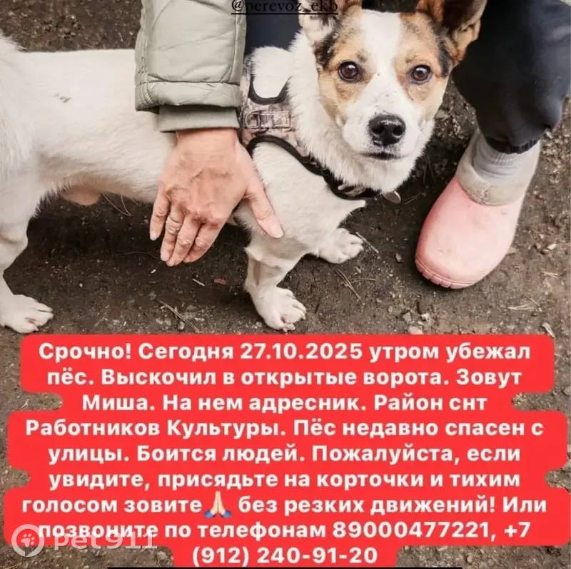 Срочно! 27.10.2025 утром убежал пёс. Выскочил в открытые ворота. Зовут Миша. Мелкий, 10кг. На нем адресник, но может потерять. Район снт Работников Культуры, Ново-Московский, Московский тракт, Екатеринбург. Неизвестно, куда пёс выйдет: может другие СНТ и поселки, а может город. Пёс недавно спасен с улицы. Боится людей. Пожалуйста, если увидите, присядьте на корточки и тихим голосом зовите без резких движений! Или позвоните по телефону 89000477221