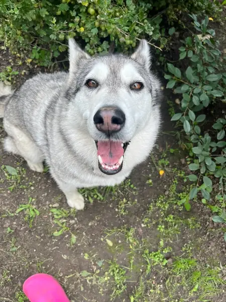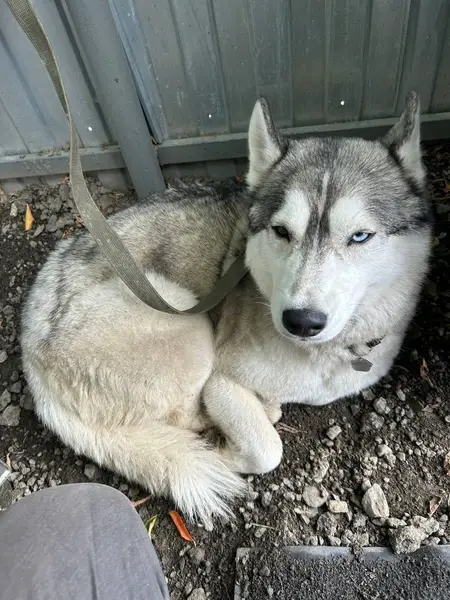 Ошейник, поводок, серый окрас, цвет глаз разный, ухоженный, чистый хаски.