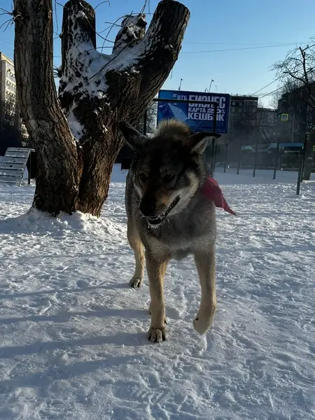 Был в коричневом ошейнике с корабином, одно ухо не стоит, голубые глаза