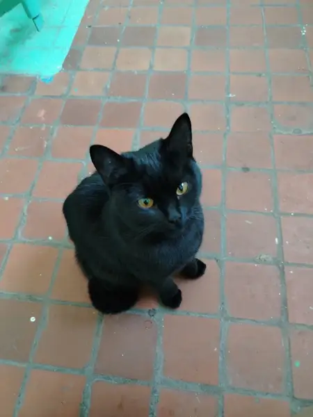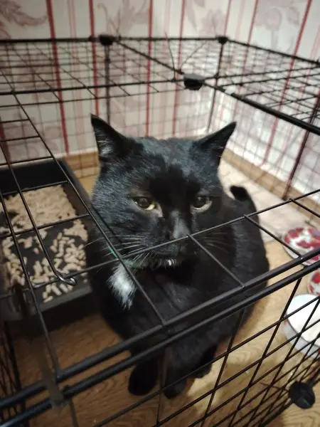 Черный кот, немного дырявое ухо, большой, черный и тяжелый, белое небольшое пятно на шее