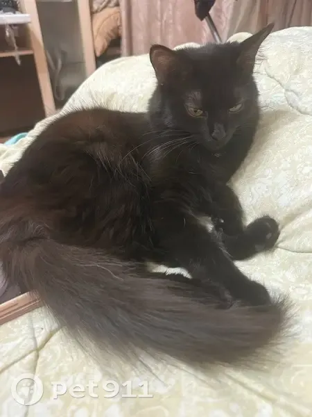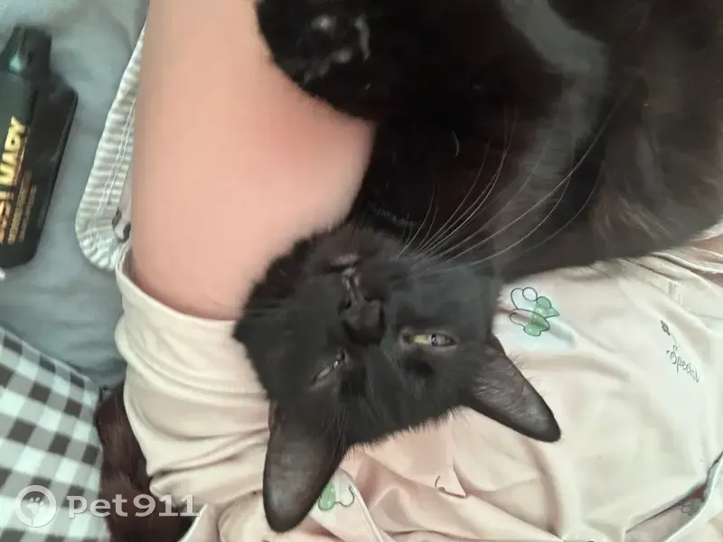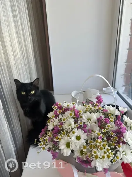 Черная, маленькая кошка. Очень худенькая, на вид как котенок. Толком не мяучет, всего боится. Очень домашняя, на улице никогда не была. Есть белое пятно на шее, по всей шерсти есть немного седых белых волос. Очень ласковая, ручная, никогда не видела других животных.