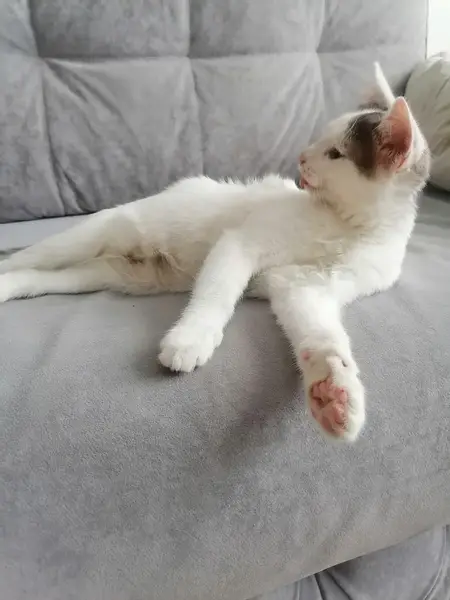 Котик 9 месяцев , крупный , сам белого цвета , на голове пятна и хвост серо/коричневые , всегда гулял по территории двора , живет в частном доме , выпрыгнул за забор судя по следам на снегу , а обратно не смог забраться , возможно испугался собак и убежал