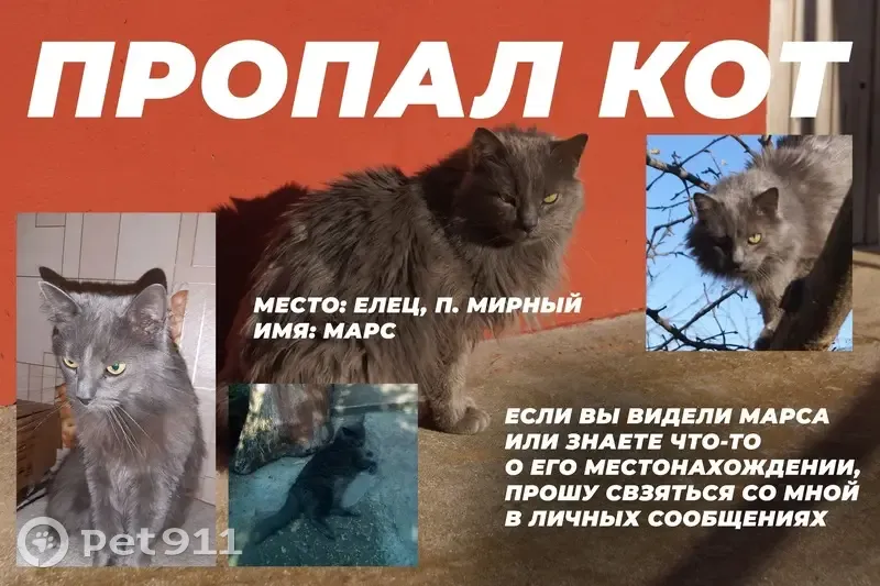 Серый дымчатый длинношерстный кот. Желтые глаза. Без ошейника. Неделю назад вышел из дома и не вернулся! Привычки гулять на улице не имеет Если вы видели Марсика или похожего на него кота, если вы знаете, где он находится, прошу связаться со мной! (желательно по ватсап, смс). Благодарна каждому за помощь!