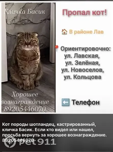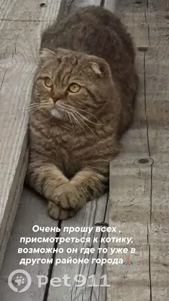рыжевато-коричневый окрас. Глаза рыжие. На нём серый ошейник. Хвост толстенький. Добрый и доверчивый кот. Шерсть на ощуп мягкая. Котик кастрированный. На вид лет 3-4. Дальше огорода никогда не уходил, а тут под забором нашел лазейку и ушёл. Район незнает, чувство опастности нет. Может не убежать от движущейся машины.