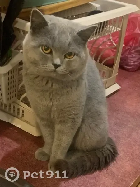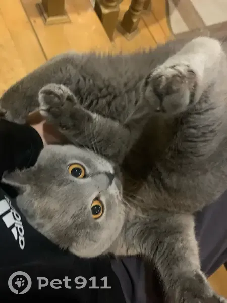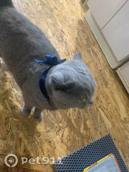 Британец, серый (голубой). Полтора года. На шее красноватый ошейник от блох, на ухе нету кусочка так как он подрался во дворе. Убежал из ворот в то время когда рабочие меняли окна у нас. Приходил к воротам, несколько раз видели по камерам, но поймать к сожалению не смогли. В первый день приходил, последующие дни нет.(