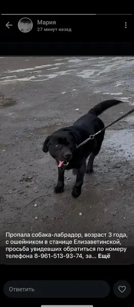 Девочка 20 кг, чёрный окрас как квадрат Малевича, похожа на лабрадора. Прибилась на улице. К людям тянется на поглажку, дружелюбная, но пугливая. Уже учится отстаивать права у других собак, ездить на авто. От паразитов обработана. Ищет свою семью. Готов привести по краю